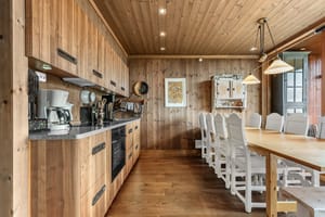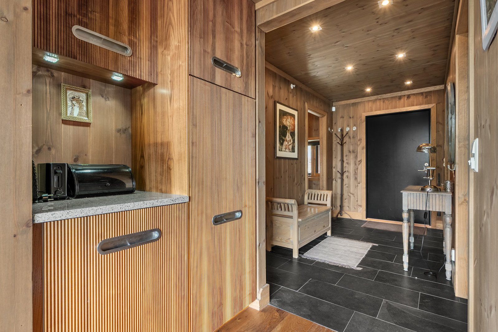 trepanel og innfelte downlights. Innredning med profilerte fronter i valnøtt, benkeplate i stein med