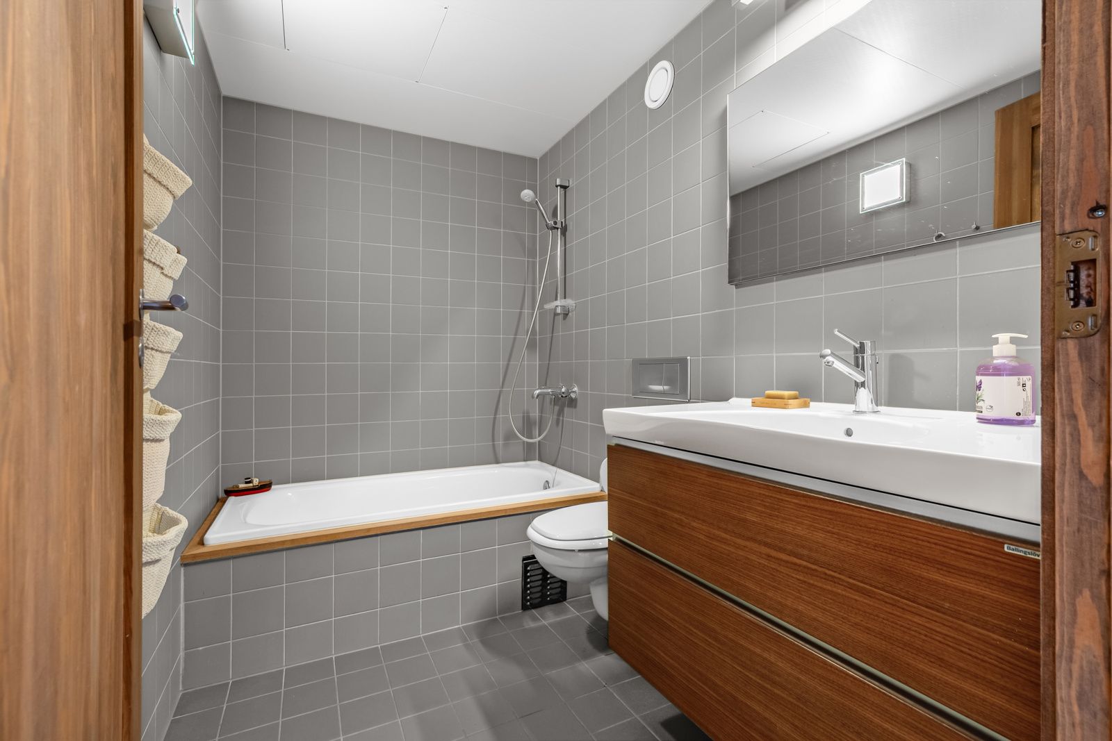 Prefabrikkert baderomskabin med flislagte gulv og vegger, badekar med hånddusj, vegghengt toalett.