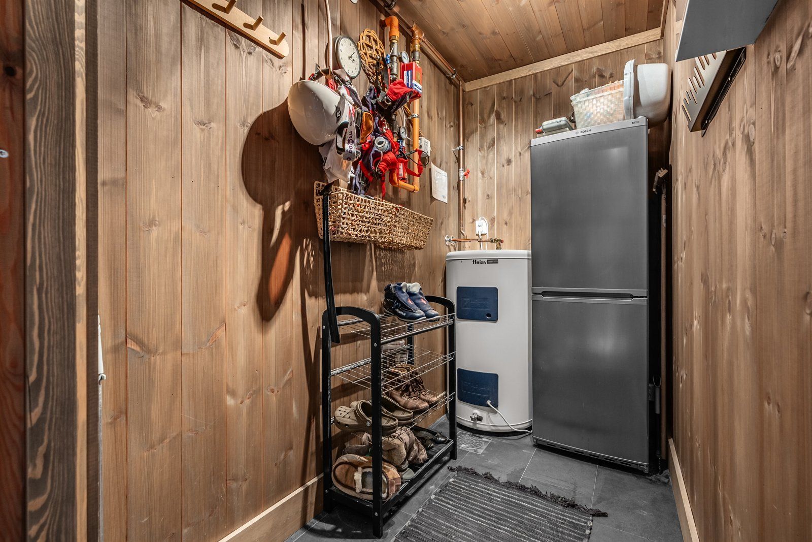 Varmtvannsbereder på 200 liter fra 2010, koblet via stikkontakt med sikkerhetsventil. Sluk i gulv. Ingen