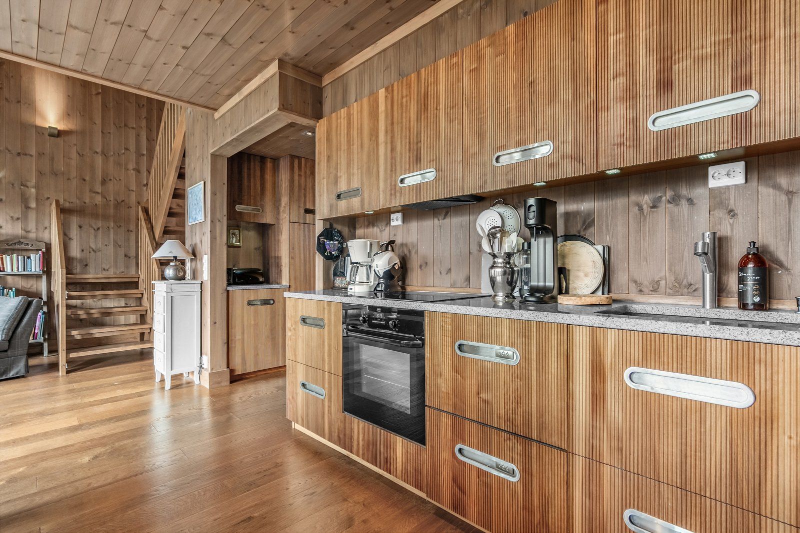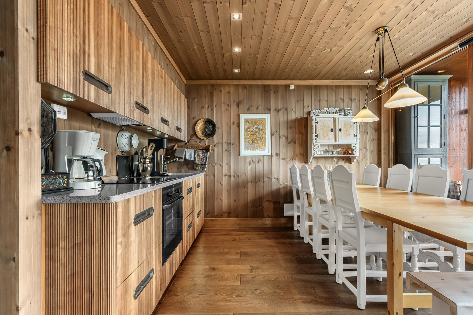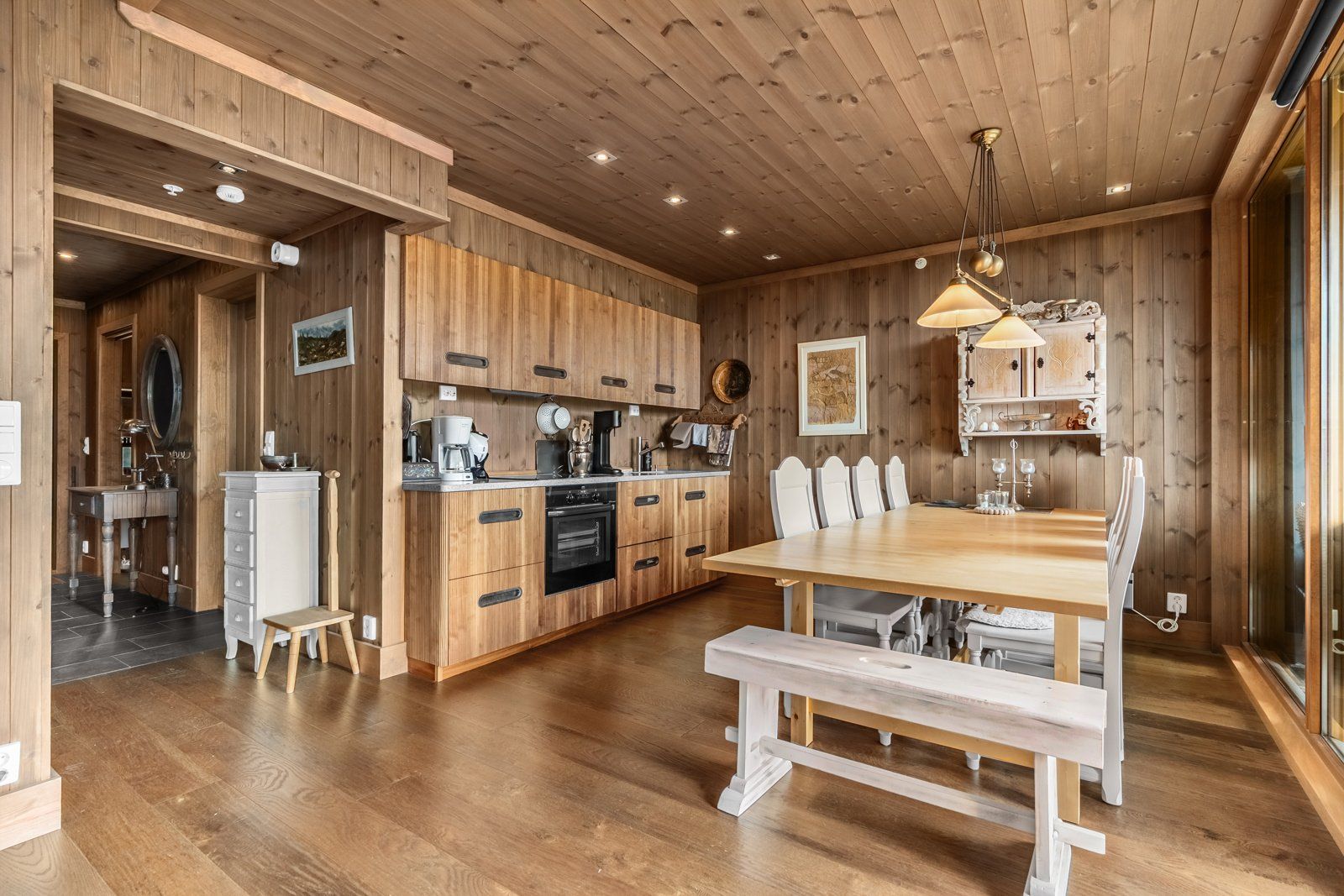 Åpen løsning mot stue. Gulv med en-stavs eikeparkett, vegger med beiset trepanel, himling med beiset