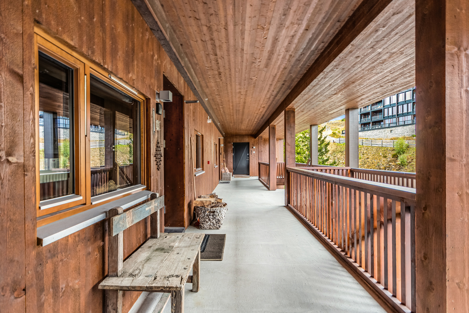 rekkverk av metall med stående spiler. Takoverbygg med panel. Regnvann føres bort via takrenner og